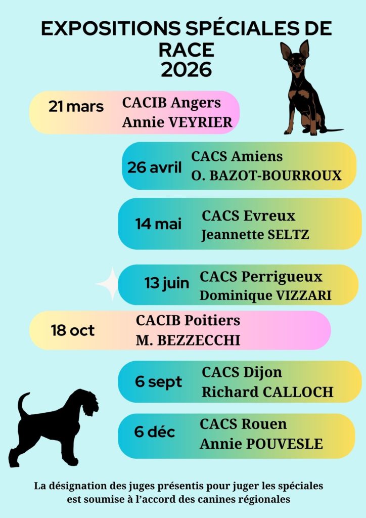 - Organiser la Nationale d’Élevage du Club Français du Schnauzer et du Pinscher. Cette exposition est reconnue comme Championnat du Club de race avec attribution du titre de Champion de France de conformité au standard. Cette manifestation a lieu une fois par an.