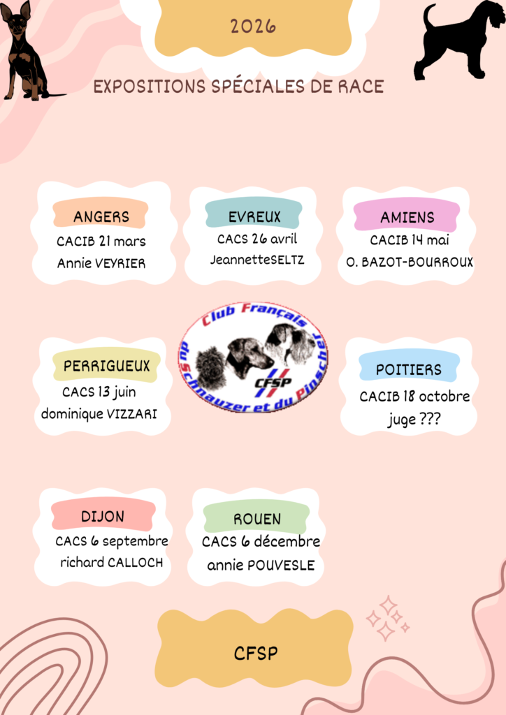 - Organiser la Nationale d’Élevage du Club Français du Schnauzer et du Pinscher. Cette exposition est reconnue comme Championnat du Club de race avec attribution du titre de Champion de France de conformité au standard. Cette manifestation a lieu une fois par an.